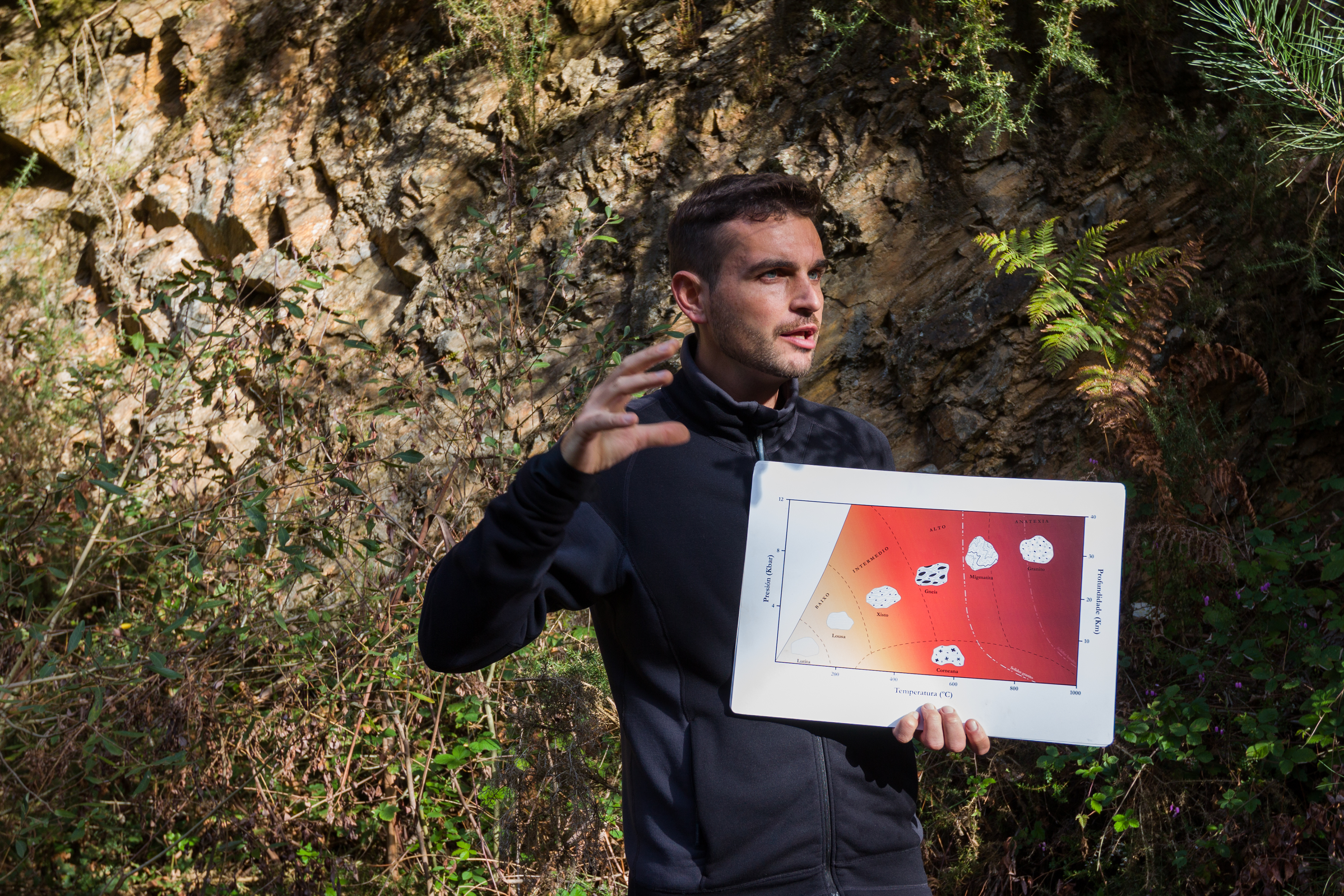 Mirando ao val do Castro a lóxica empúrranos a pensar que foi o río quen moldeou a paisaxe traballando paseniñamente durante milleiros de anos. E si, o río algún choio fixo, pero non todo. É máis, o traballo gordo hai que atribuírllo aos movementos de formación da Terra ao longo de tanto tempo que mesmo é difícil facerse unha idea da súa duración. O xeólogo Francisco Canosa guiou este sábado unha ruta por unha pequena parte do río Castro e polo estremo máis oriental do Forgoselo para explicarlles a unha trintena de persoas por que esta zona é tan peculiar desde o punto de vista xeolóxico. O primeiro que contou foi, precisamente, que o río Castro non labrou o terreo, senón que a súa bacía percorre unha falla -unha fenda- formada onde se atopan o grande bloque granitoide que é o Forgoselo e un terreo de sedimentos procedentes do contorno de Gondwana, unha das partes en que se dividía o supercontinente Pangea hai 300 millóns de anos. Case nada.