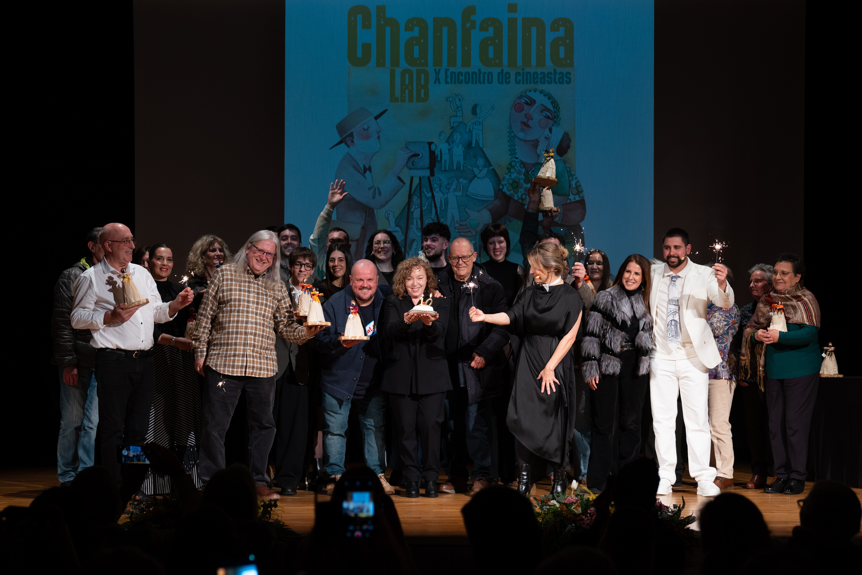 A Casa da Cultura de San Sadurniño acolleu este sábado a gala das estreas das curtametraxes filmadas ao abeiro do Chanfaina lab o pasado mes de setembro. O encontro audiovisual festexou a súa décima edición cunha auditorio cheo de veciñanza e realizadoras de dentro e de fóra da casa que compartiron tres intensos días de rodaxe para poder servir esta tarde auténticas delicias visuais. Ficción, documental, experimental, narrativas frescas, en definitiva, feitas con amor e por amor ao audiovisual, esencia mesma do Chanfaina. A festa do cine local serviu tamén para entregarlle o II Premio Bernardino de Lamas ao cineasta da natureza José Roberto Fernández López. Neste décimo aniversario chanfaineiro tamén houbo torta e “parabéns para ti, nesta data querida…etc, etc.”. Carmen Suárez e Manolo González, promotores da iniciativa, visiblemente emocionados, sopraron as candeas entre o cariño de público e participantes.