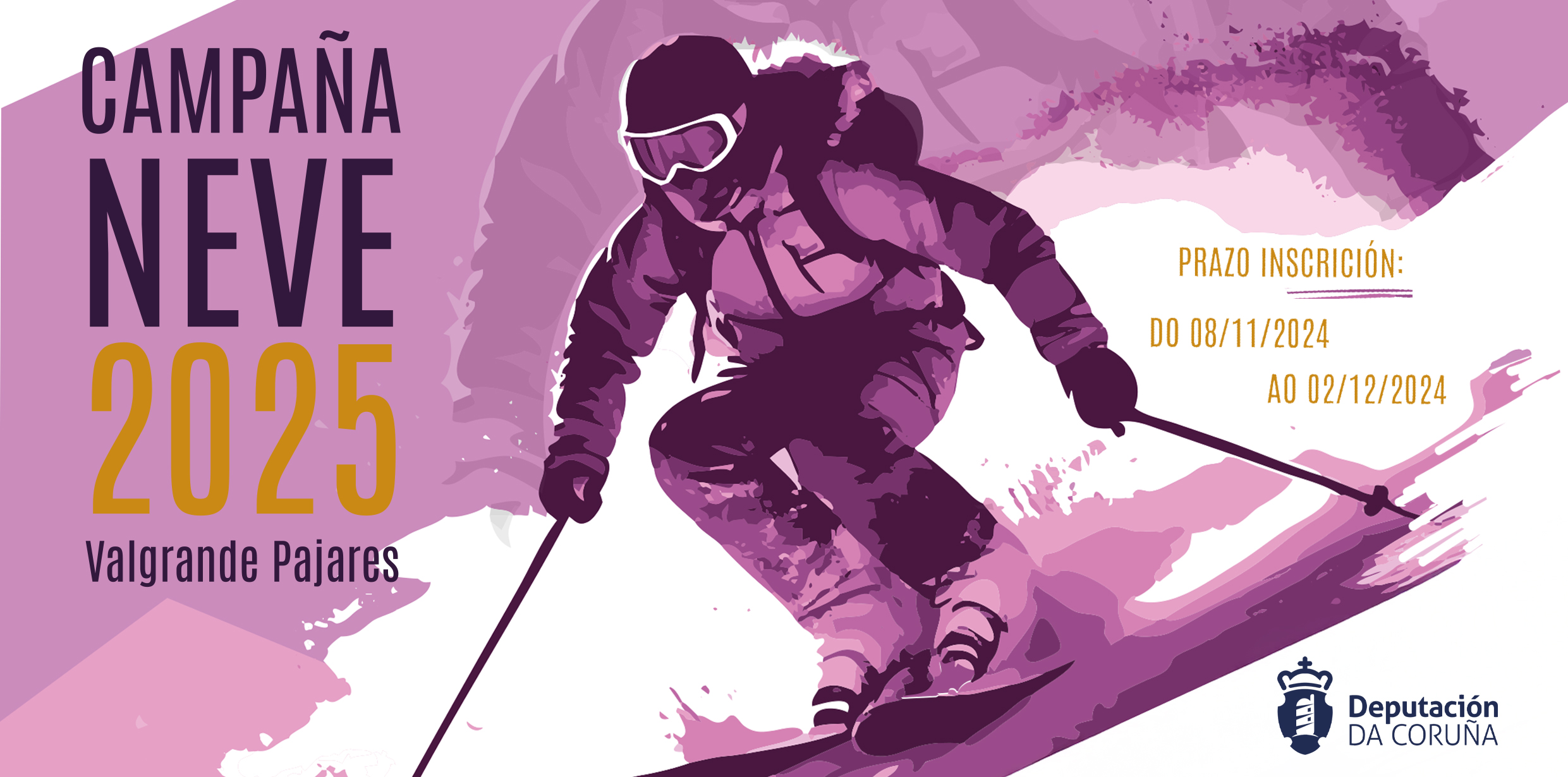 A Deputación da Coruña volve convocar a súa campaña na neve, dirixida á rapazada empadroada en calquera concello da provincia con idades comprendidas entre os 11 e 15 anos (feitos a 31 de decembro de 2024). Nesta edición volverán ir á estación de Valgrande-Pajares en 6 quendas que comezarán en xaneiro. Ao Concello de San Sadurniño tócalle a terceira, entre o 24 e o 27 de xaneiro, ambos días incluídos. De novo volve haber 4 prazas dispoñibles e, por esta razón, o departamento municipal de Deportes manterá aberto ata o próximo 2 de decembro o período de preinscricións. Se houbese máis peticións que prazas ofertadas, farase un sorteo público o 3 de decembro ás 12:30h na Casa do Concello. As solicitudes deben presentarse na Casa da Cultura ou na Sede Electrónica do Concello de San Sadurniño cumprimentando a parte final deste folleto informativo, que pode cubrirse directamente desde o navegador.
